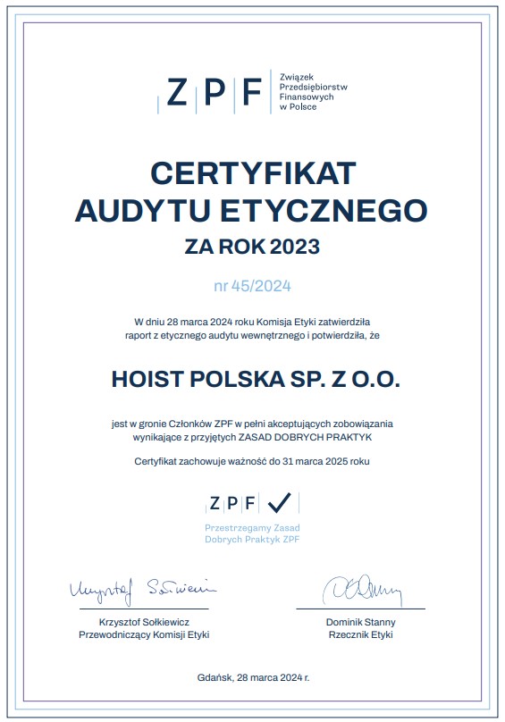 Warto dodać, że Hoist Polska Sp. z o.o. otrzymał Certyfikat Etyczny ZPF, który jest potwierdzeniem zgodności praktyk biznesowych firmy z Zasadami Dobrych Praktyk ZPF. Jako Członek Związku Przedsiębiorstw Finansowych w Polsce (ZPF) raz w roku przechodzimy Audyt Etyczny, prowadzony przez Komisję Etyki ZPF, sprawdzający stosowanie się do Zasad Dobrych Praktyk. Powyższy certyfikat potwierdza, że przeszliśmy audyt z wynikiem pozytywnym.